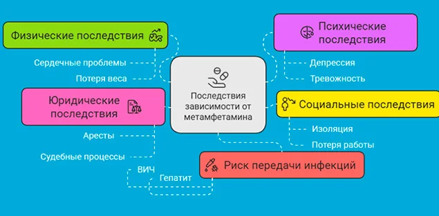 Зависимость от метамфетамина может вызвать серьезные и долгосрочные последствия для здоровья, отношений и качества жизни человека. Вот некоторые из наиболее распространенных последствий зависимости от метамфетамина: